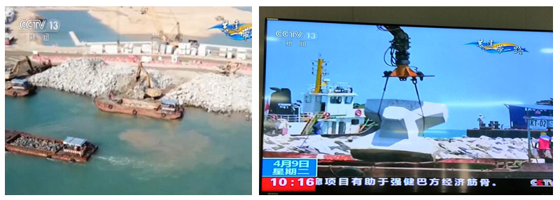 中交四航局科倫坡港口城項目部副經理 徐傑:我們其實可以看到,“扭王字塊”是一個不規則的棱體,首先能確保棱體之間能夠起到很好的勾連效果,確保整個護面的一個穩定,棱體勾連之間又有一定的空隙,這個空隙能起到很好的消浪效果。