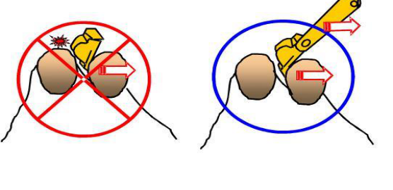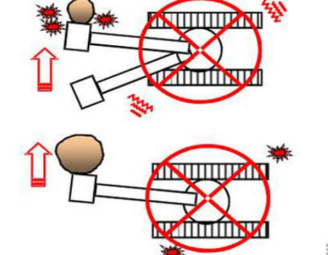 第一種禁止的操作動作是:挖鬥撬動物體來進行挖掘作業。如左圖所示,挖鬥背面碰撞岩石,由於(yú)杠杆原理而使高於(yú)油壓力數倍的力量作用在鬥齒上,這樣操作不挖鬥背面容易磨損,還會使鬥齒産(chǎn)生裂痕等,這樣是很傷挖鬥的。