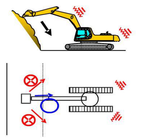 挖掘機在高處挖掘作業時,即使是鬥齒(chǐ)未插入土中也不能進行回轉作業,因爲鬥齒(chǐ)很容易撞擊到堅硬的岩石,不僅會對鬥齒(chǐ)造成傷害,還會對工作裝置造成影響,可能造成大臂彎曲變(biàn)形,從而影響挖機的使用壽命。