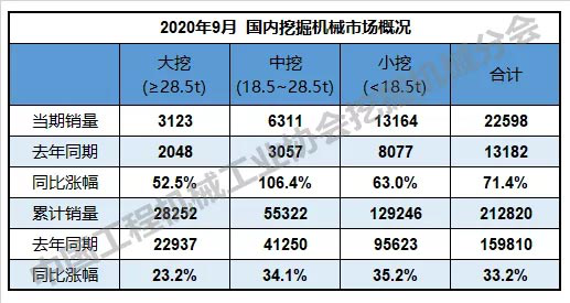 2020年1-9月,共銷售挖掘機236508台,同比增長32%;其中國内212820台,同比增長33.2%;出口23688台,同比增長22.2%。